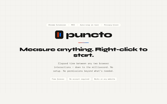 Puncto Timer, Chrome tarayıcısı için geliştirilmiş bir eklentidir. Bu ücretsiz araç, web sayfalarındaki iki etkileşim arasındaki geçen süreyi milisaniye hassasiyetiyle ölçmeyi sağlar. Kullanıcılar, herhangi bir öğeye sağ tıklayarak zamanlayıcıyı başlatabilir ve beklenen metin DOM'da belirdiğinde otomatik olarak durmasını sağlayabilir. Ayrıca, manuel durdurma seçeneği de mevcuttur. Bu özellikler, kullanıcı deneyimi ve performans testleri gibi çeşitli senaryolar için oldukça faydalıdır.